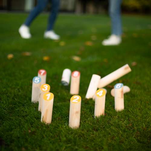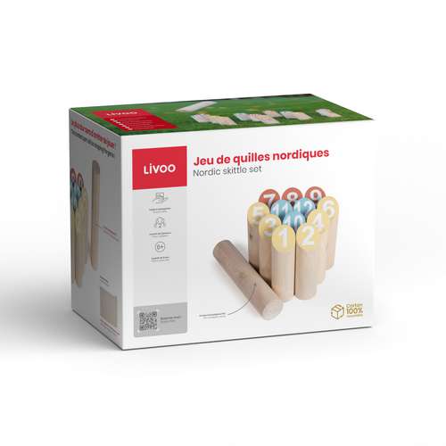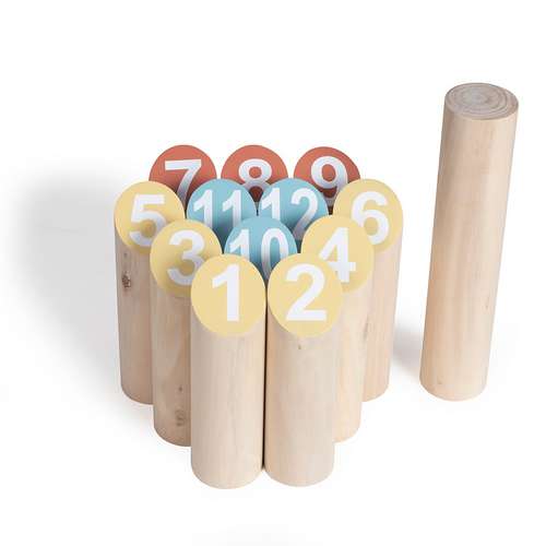 12 quilles en bois d’eucalyptus FSC numérotées de 1 à 12 de 14,8 x 4,5 cm