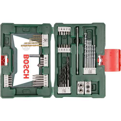 6 forets à métaux à revêtement TiN, 6 forets de maçonnerie à pointe en carbure et 5 forets à bois avec pointe de centrage.