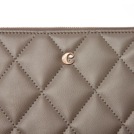 La pochette Cacharel est un luxueux accessoire plat qui peut être utilisé comme pochette de soirée ou comme pochette à cosmétiques à placer dans le sac fourre-tout éponyme. Confectionnée dans une matière matelassée, elle arbore une double signature avec un C principal sur le devant et une petite signature Cacharel en or au dos. La pochette est fabriquée en cuir végétal magnifiquement texturé et est proposée dans une palette de couleurs neutres, dont le noir et le taupe. Son design polyvalent en fait un complément pratique et élégant à toute garde-robe.